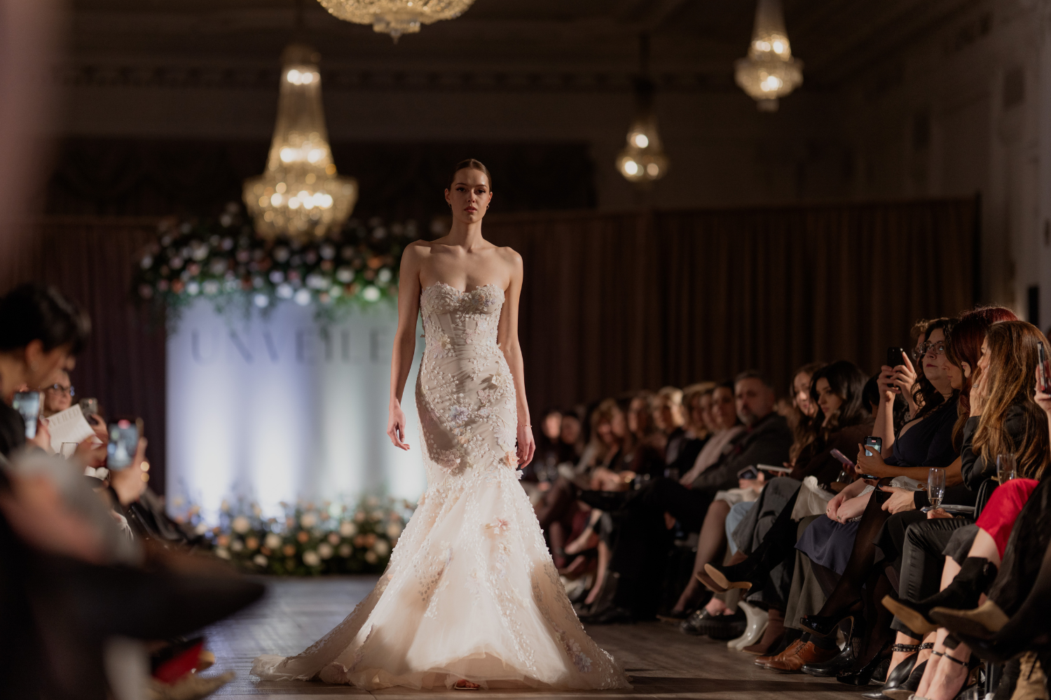 “What makes UNVEILED so unique is that it gives couples and industry experts the chance to mingle in a cocktail party setting. It’s such a magical night under the crystal chandeliers at the Fairmont,” says show producer Lenora Kingcott. “Our tech sponsor, Encore Global, lights up the runway and surrounds our guests with music that carries them away, much like it does at weddings throughout the city.”